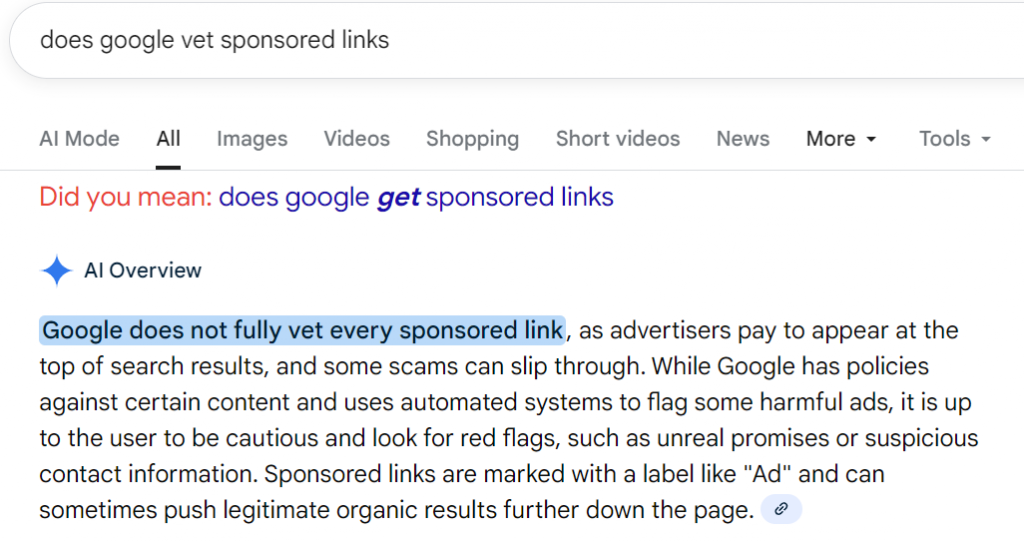 Right at the top, you see a sponsored link. You click it without thinking twice — because who has time to scrutinize URLs when everything feels on fire? Also - Sponsored means VETTED by Google - right? (answer is - doesn't look like it)*.
