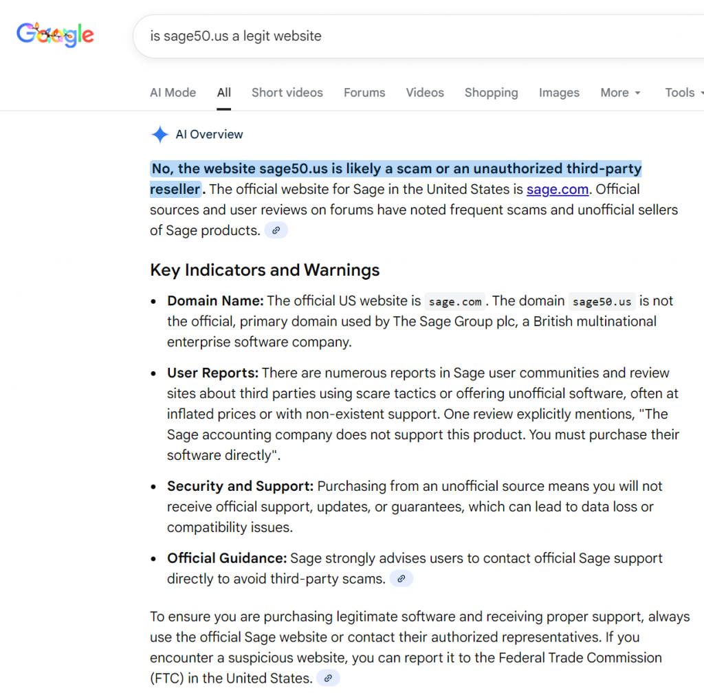 (Shown above — the legit Sage ad sits right above the fake one.) - Domains that are close… but slightly off